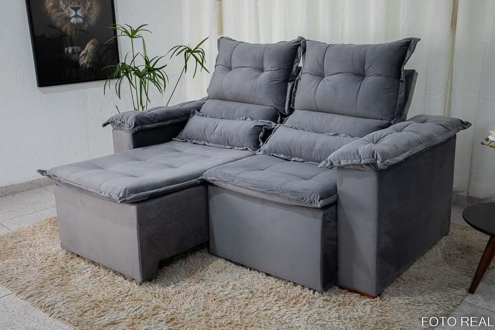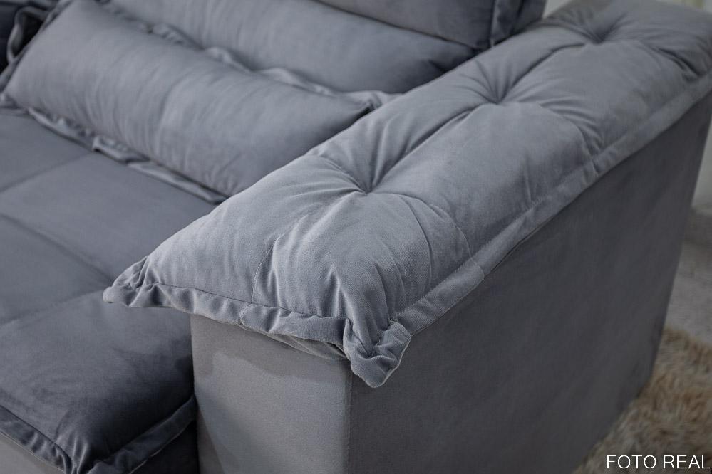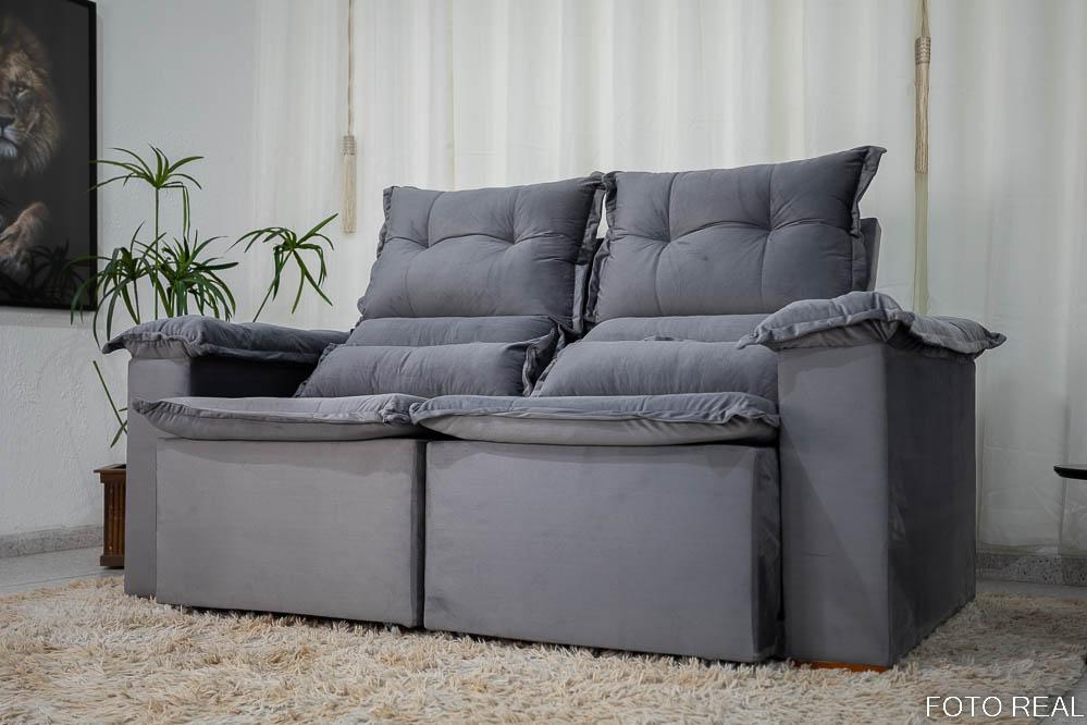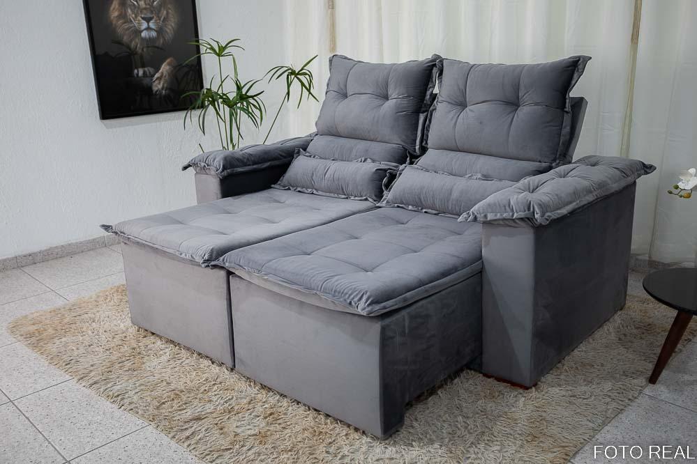 O sofá retrátil e reclinável Nicole de 1,80m, revestido em veludo grafite, é uma escolha elegante e confortável para qualquer ambiente.