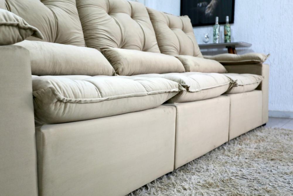 O assento desse belo sofá retrátil é feito com percintas Italiana, pillow preenchido com flocos de espuma com 15cm de espessura. Além disso, as corrediças para movimentação do assento no abrir e fechar são em tubo de ferro, com isso a qualidade e acima de tudo, a durabilidade aumentam significativamente.