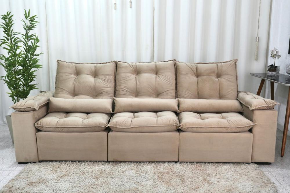 O encosto é feito flocos de espuma o que proporciona maior conforto. Além disso, possui várias posições de inclinação e acompanha duas rineiras. Um detalhe muito importante é a ausência da caixa atrás do sofá, assim você otimiza muito mais seu espaço.
