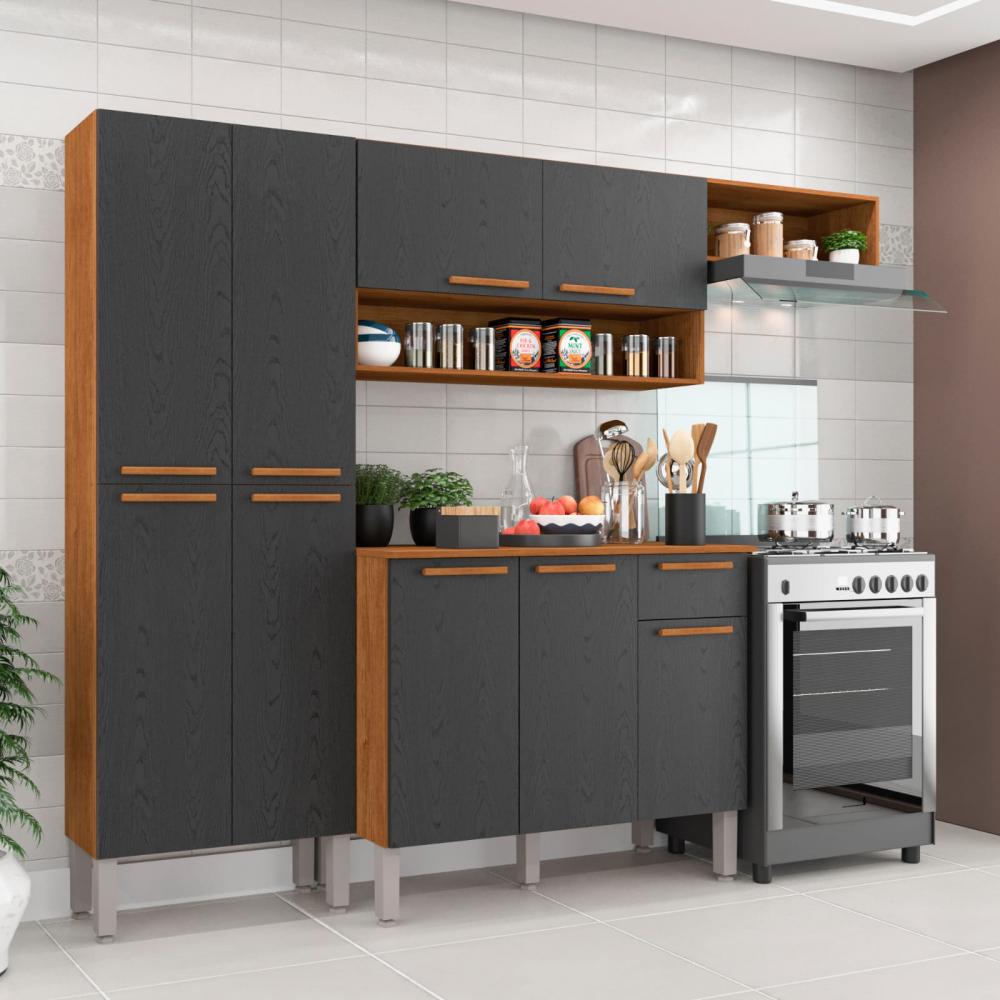 Cozinha Madri 3 Peças, Côr Cinamomo/Preto, da Salleto Medidas: Alt 1,86m Larg 2,29m Prof: Balcão 0,45m - Paneleiro 0,26m - Peso 68,5Kg - 2 Volumes - Estrutura 100% MDP 12mm Tampo do Balcão, Frente das Gavetas e Portas MDP 15mm, 9 Portas de Bater com Dobradiças Metálicas, 1 Gaveta com Corrediças Telescópicas, 2 Nichos Externos para Eletrodomésticos e Utensílios Domésticos, Balcão com Amplo Espaço para Forno Elétrico ou Micro-Ondas, 3 Prateleiras Internas, sendo 2 no Paneleiro e 1 no Balcão. Puxadores de Madeira, Pés Pásticos Reguláveis e Acabamento em Pintura UV Semi-Brilho/Fosco. OBS.: Dupla Opção de Montagem.