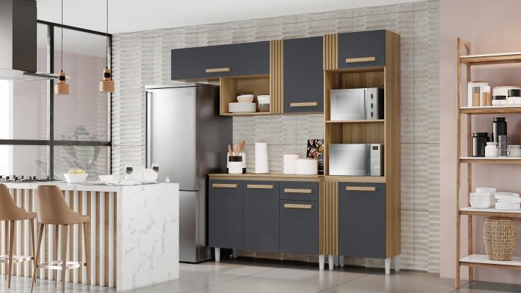 Cozinha Compacta Vitória com Balcão Naiomi, Côr: Atacama/Grafite, da Aramóveis, Medidas Cozinha: Alt 2,07m Larg 2,40m Prof 0,378m - Balcão: Alt 0,84m Larg 1,20m Prof 0,48m - Estrutura 100% MDP 12 e 15mm, 7 Portas de Bater com Dobradiças Metálicas, 1 Gaveta Corrediça Metálica, 2 Nichos para Fornos e 1 Nicho para Objetos, 3 Prateleiras, Detalhes Ripados, Puxadores de MDF e Pés Plásticos de PVC.