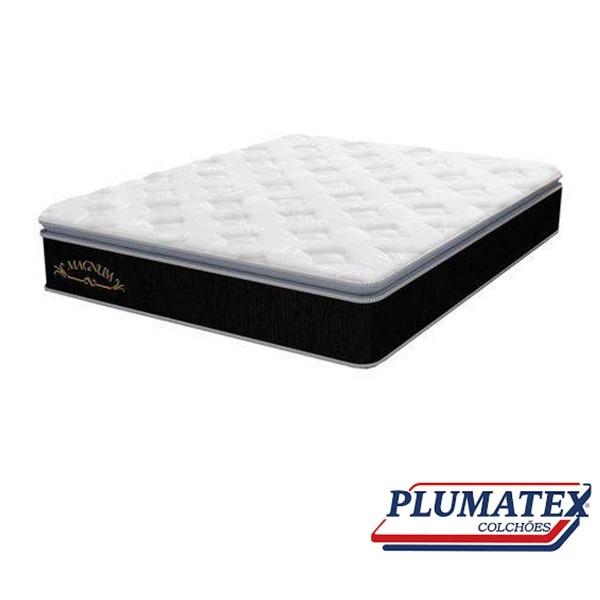 Colchão King Magnum, Côr Branco/Preto, da Plumatex, Medidas: Alt 0,28m Larg 2,03m Prof 1,93m, Estrado de Molas Ensacadas Individualmene, Espuma em Camada Extra D28 Kg/m³, Pillow Top em Malha, Tecido Malha Bordado 80% Algodão 20% Poliester, Laterais em Chenille, Antiácaro, Antifundo, Antialérgico e Antimofo, Nivel de Conforto Firme, até 110kg por pessoa.