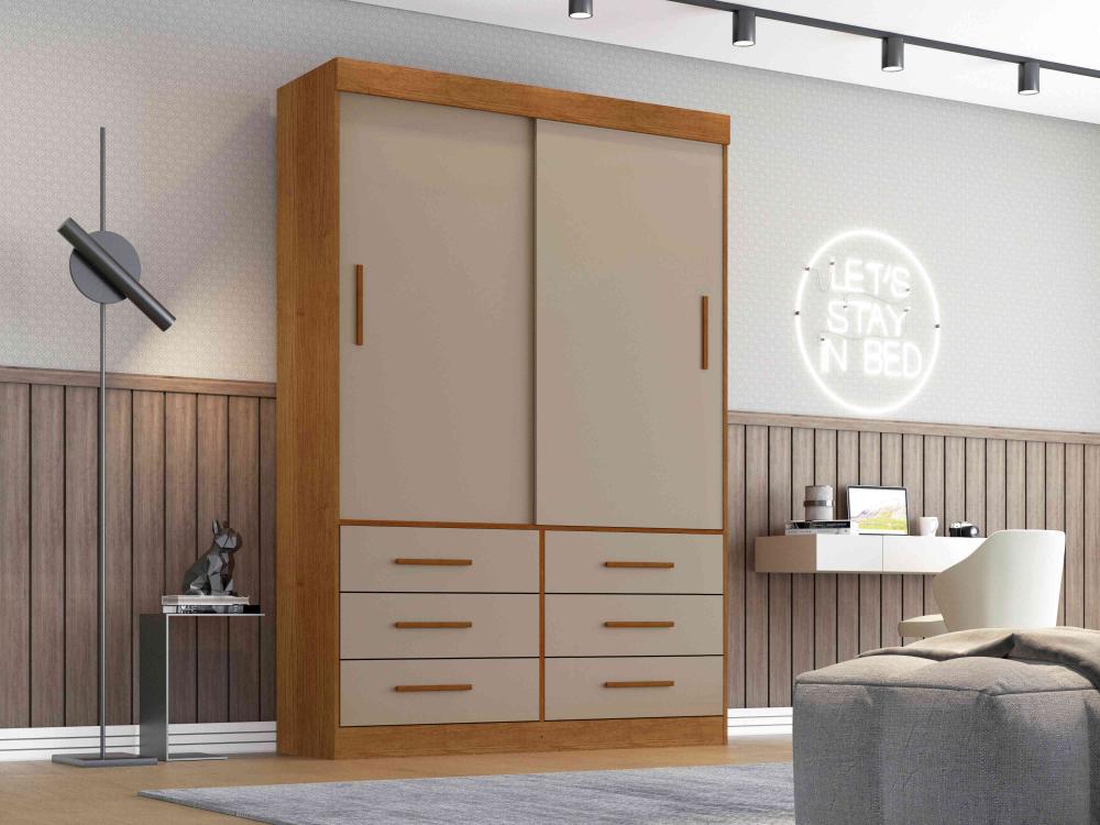 Roupeiro Star, Côr Cinamomo/Off White, da Salleto, Medidas: Alt 2,17 Larg 1,192m Prof 0,47m Peso 82,5Kg - 3 Volumes - Estrutura 100% MDP, 2 Portas de Correr com Roldanas Metálicas e Trilhos de Aluminio, 6 Gavetas com Corrediças Telescópicas, 1 Cabideiros, 4 Nichos Internos para Roupas e/ou Objetos Pessoais e Puxadores de Madeira. OBS.: ESPELHO OPCIONAL.