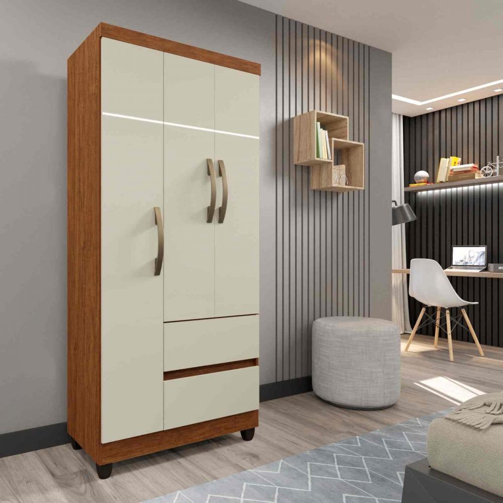 Roupeiro Lisboa 3P2G, Côr Cinamomo/Off White, da Imop Móveis, Estrutura 100% MDP, Medida Alt 1,91m Larg 0,77m Prof 0,40m, 3 Portas de Bater com Dobradição Metálicas e Puxadores de PVC Metalizado Bronze, 2 Gavetas Externas com Corrediças Metálicas Telescópicas, 3 Prateleiras, 4 Nichos para Roupas e Objetos Pessoais, Cabideiro de Madeira Revestido de PVC e Pés Plásticos de PVC.
