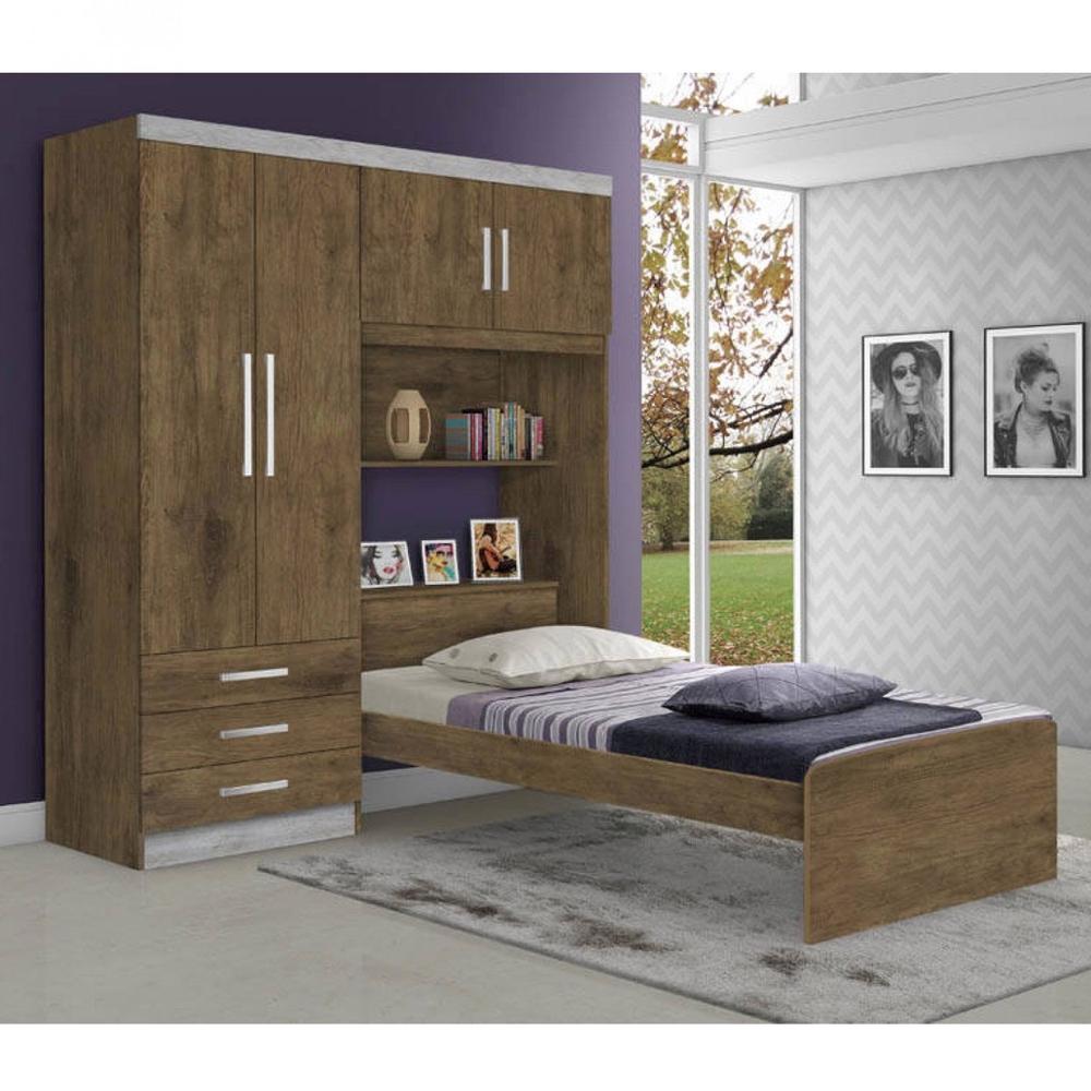 Roupeiro CAma Cancun 4P3G com Cama de Solteiro, Côr Jequitibá/Avelã, J&A Moveis, Medidas: Alt 2,00m Larg 1,57m Porf 0,46m. Estrutura 100% MDP, 4 Portas de Bater com Dobradicas Metálicas, 3 Gavetas Externas com Corrediças Metálicas, 1 Prateleira Externa, Cabeceira Baú com Tampa, Cabideiro e 3 Nichos Internos, Puxadores de Alumínio e Cama: A 0,45 L 0,95m P 1,92m. Montagem Reversível