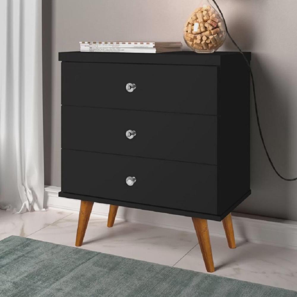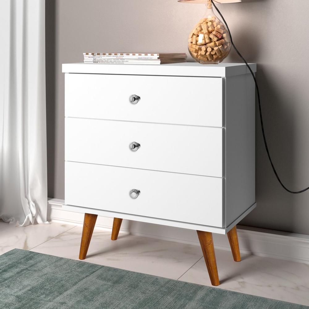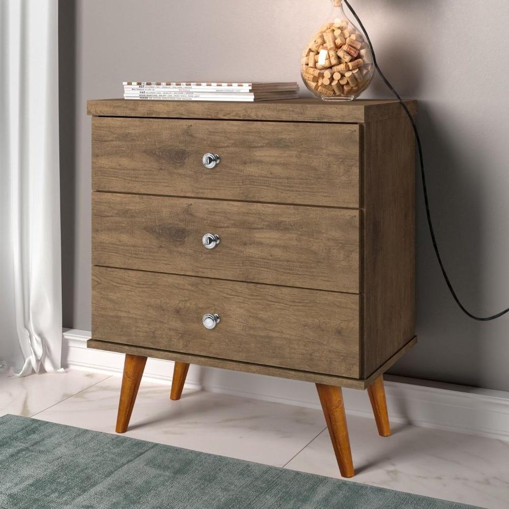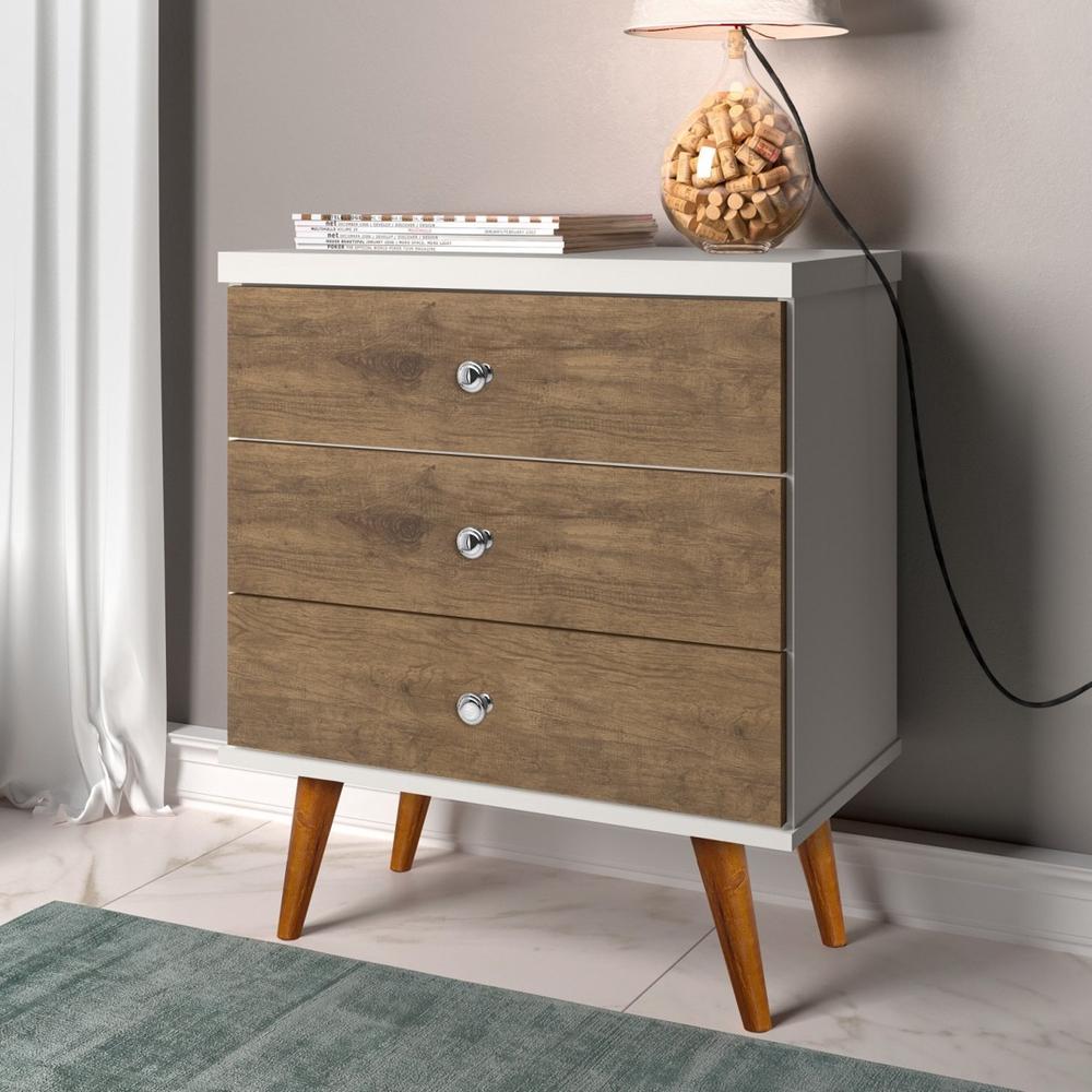 Medidas: Alt 0,69m Larg 0,60m Prof 0,34m, Estrutura MDF/MDP, 3 Gavetas com Corrediças Metátilcas e Puxadores Metalizados, Pés de Madeira Maciça de 19cm.