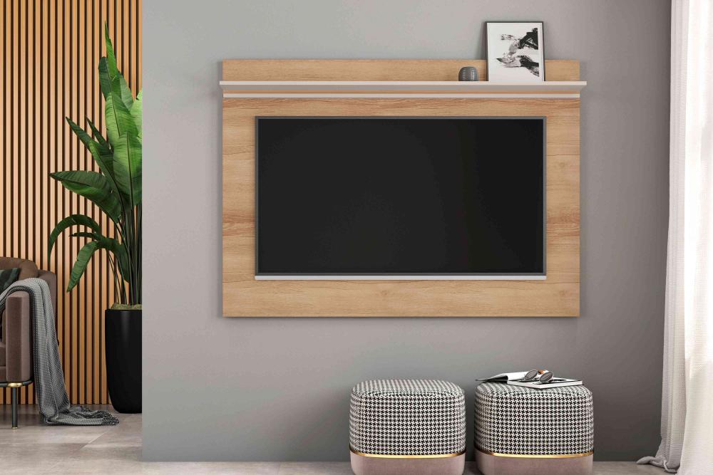 Painel Ferrara, Côr Cedro/|Off White, da Frade, Medidas: Altr 1,08m Larg 1,50m Prof 0,172m, Estrutura MDP/MDF, com 1 Prateira e Furação para Fios. Ideal para TVs até 55 Polegadas.