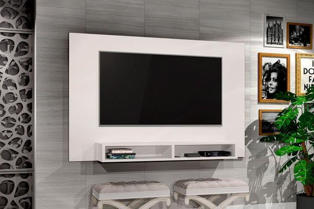 Painel Manhattan, Côr Branco, da J&A Moveis, Medidas: Alt 0,90m Larg 1,37m Porf 0,26m, 100% MDP, Bancada com 2 Nichos para Eletroeletrônicos ou Objetos Decorativos. Ideal para TVs até 42 Polegadas.