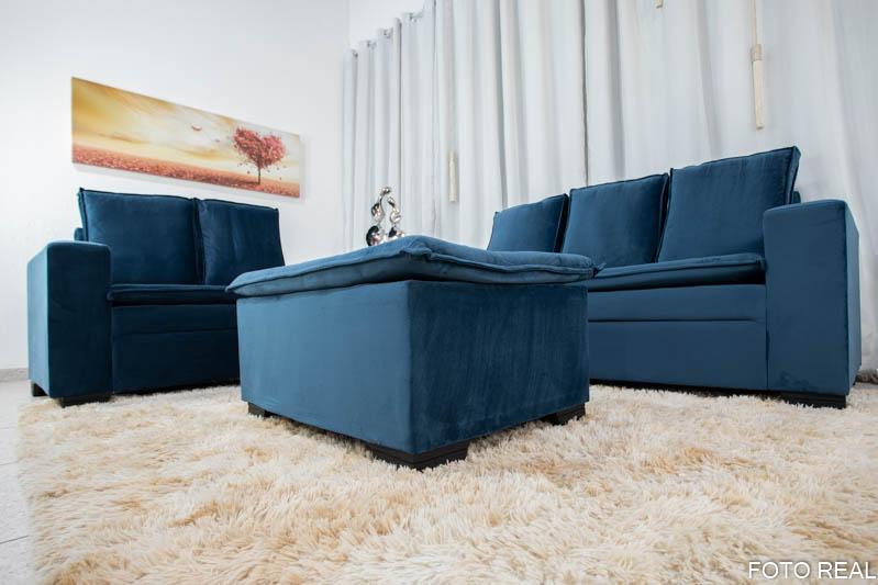 Sofá 3 e 2 lugares França com Puff Veludo Azul A16