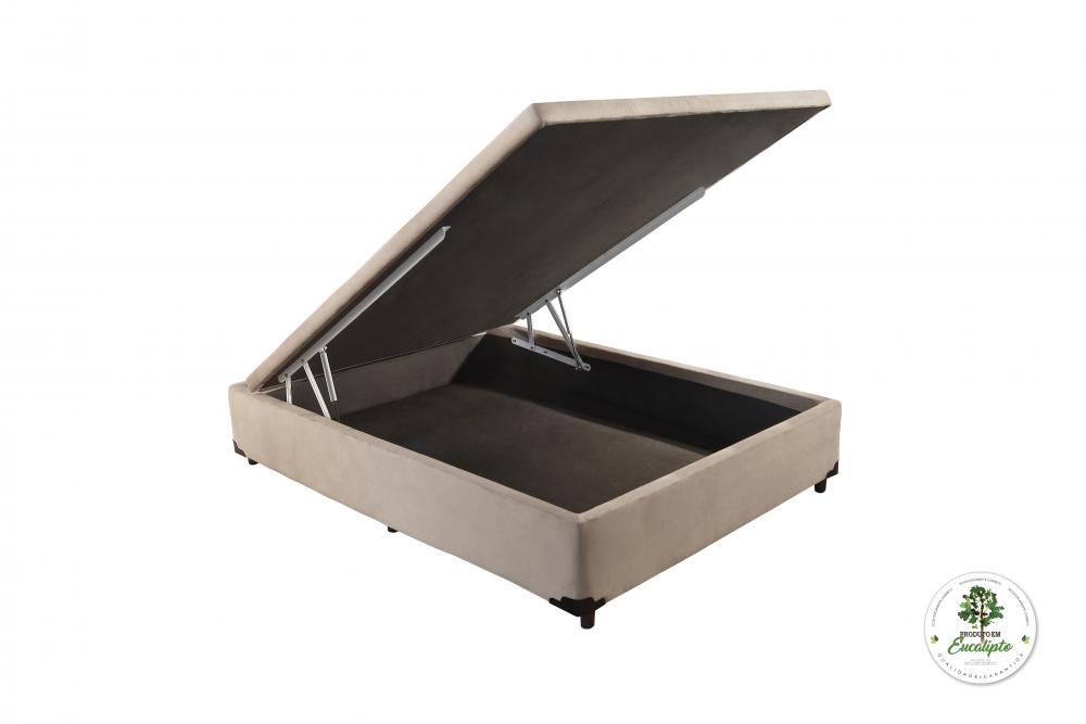 Base Bau Casal, em Corino, Côr Bege, da SR Movelaria, Medidas: Alt sem Pés 0,34m Larg 1,38m Prof 1,88, Estutura 100% em Madeira de Reflrestamento Eucalipto, Tampo em Compensado de 5mm, 2 Pistão a Gás, Dobradiças Metáliocas, sem Divisória Interna, Pés Plásticos de 6cm, Revestimento Externo em Corino, Forro Interno em Strech. OBS.: