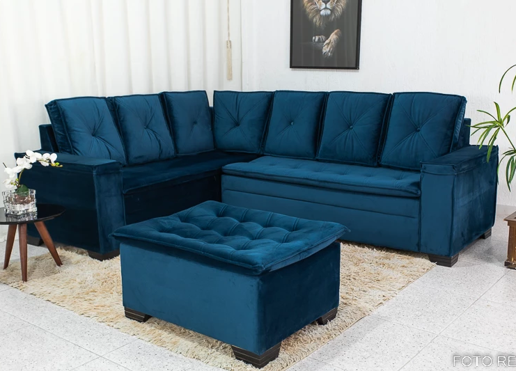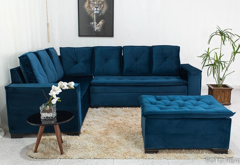 Sofá Canto 5 lugares com Puff Alemanha Veludo Azul