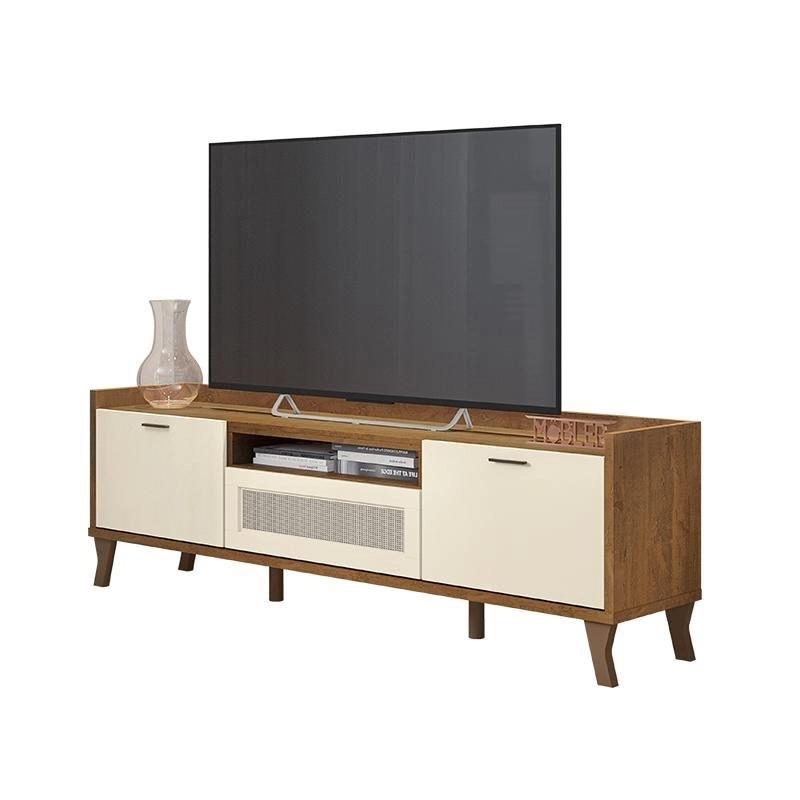 Bancada Arcade 1.8, Côr Nature/Off White, da Mobler, Medidas: Alt 0,58m Larg 1,83m Prof 0,382m, Estrutura 100% MDF sendo a Base e Laterais em Chapa de 25mm, 3 Portas Basculantes com Dobradiças Metálicas e Pistão a Gás, sendo a Central Usinada com Tela Sintética, Nicho para Objetos Decorativos, Puxadores de Alumínio e Pés Usinados de MDF. Ideal para TVs até 75". Faz Conjunto com Painel Arcade 1.8.