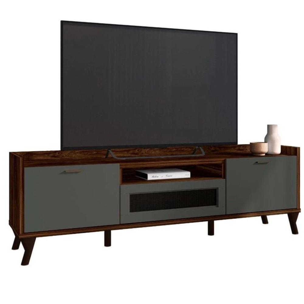 Bancada Arcade 1.8, Côr Palisandro/Cinza Ré , da Mobler, Meds: A 0,58m L 1,83m P 0,382m, Estrutura 100% MDF sendo a Base e Laterais em Chapa de 25mm, 3 Portas Basculantes com Dobradiças Metálicas e Pistão a Gás, sendo a Central Usinada com Tela Sintética, Nicho para Objetos Decorativos, Puxadores de Alumínio e Pés Usinados de MDF. Ideal para TVs até 75". Faz Conjunto com Painel Arcade 1.8.