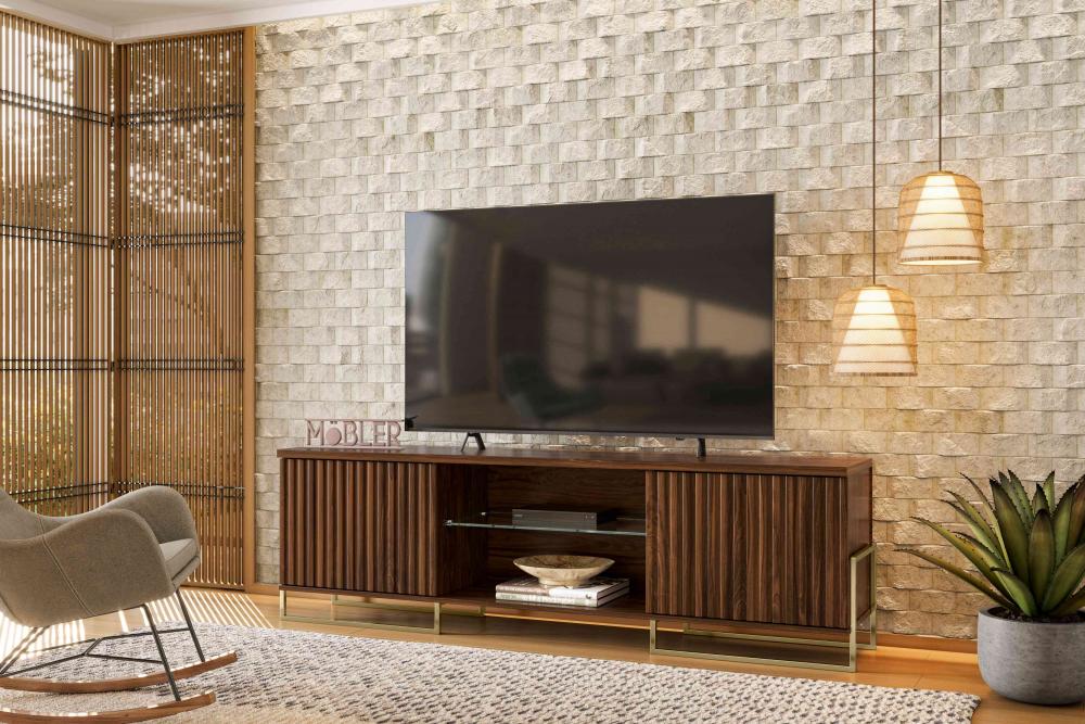 Bancada Metalica 1.8, Côr Palisandro, da Mobler, Medidas: Alt 0,54m Larg 1,80m Prof 0,38m, Estrutura 100% MDP 15mm, Tampo de MDP 25mm, 2 Portas de Bater com Dobradiças Metálicas e Detalhes Ripados em MDF Usinado de 15mm, 2 Nichos Internos para Objetos e Eletroeletrônicos, 1 Nicho Externo Central com Prateleira Externa de Vidro de 6mm e Pés Tubulares de Metal com Pintura Epoxi na Côr Dourada. Ideal para TVs até 75 Polegadas.