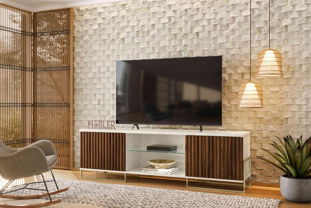 Bancada Metalica 1.8, Côr Palisandro/Off White, da Mobler, Medidas: Alt 0,54m Larg 1,80m Prof 0,38m, Estrutura 100% MDP 15mm, Tampo de MDP 25mm, 2 Portas de Bater com Dobradiças Metálicas e Detalhes Ripados em MDF Usinado de 15mm, 2 Nichos Internos para Objetos e Eletroeletrônicos, 1 Nicho Externo Central com Prateleira Externa de Vidro de 6mm e Pés Tubulares de Metal com Pintura Epoxi na Côr Dourada. Ideal para TVs até 75 Polegadas.