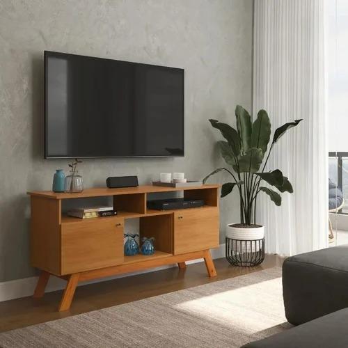 Rack Amsterdã II. Côr Nature da Tebarrot Brasil. Medidas: Alt. 0,69m Larg. 1,40m Prof. 0,418m Peso: 29,30kg 1 Volume. Produto em MDF/MDP, Base de Madeira Maciça, Pintura Semi Brilho, Tampo de 20mm em MDF com Pintura Texturizada. 3 Nichos Sendo 2 Superiores e 1 Central para Acomodar Eletroeletrônicos e Objetos Decorativos. 2 Portas com Puxador de Plástico e Dobradiça Metálica. Pés em Madeira Pinus. Ideal para TV até 43 Polegadas. Com a Possibilidade de Compor um Combo com o Painel Venus.