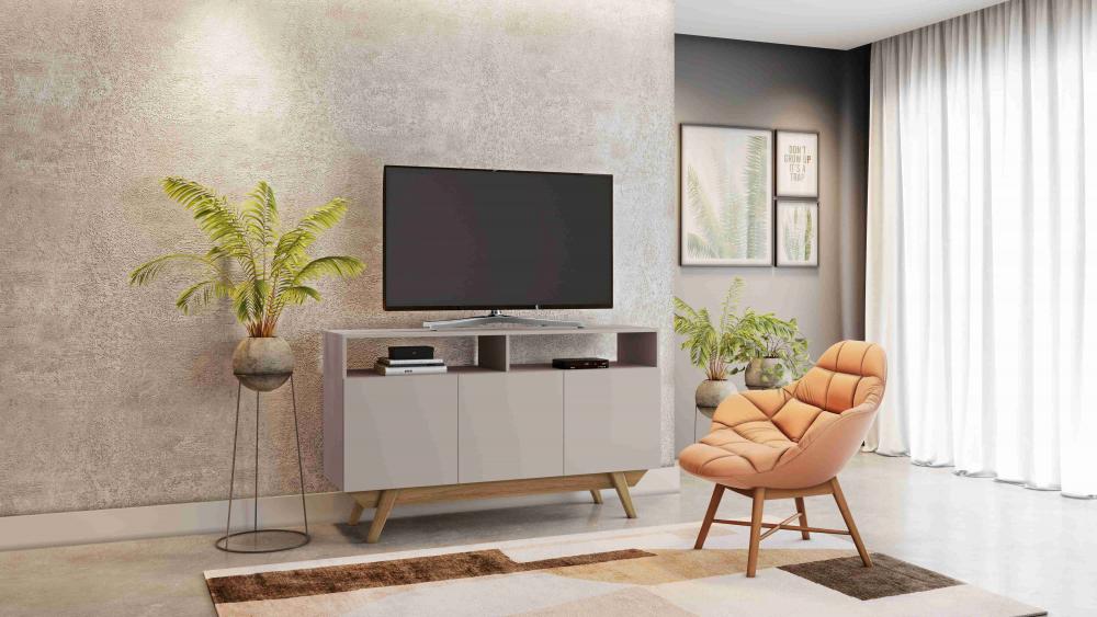Rack Celebrar, Côr Off White/Noronha, da JCM, Medidas: Alt 0,80m Larg 1,365m Prof 0,39m, Estrutura 100% MDP em Chapa de 15mm, 3 Portas de Bater com Dobradiças Metálicas de Pressão, 2 Nichos para Eletroeletrônicos ou Objetos Decorativos, Pés de Madeira Maciça, (Não possui prateleira interna). Ideal para TVs até 56 Polegadas.