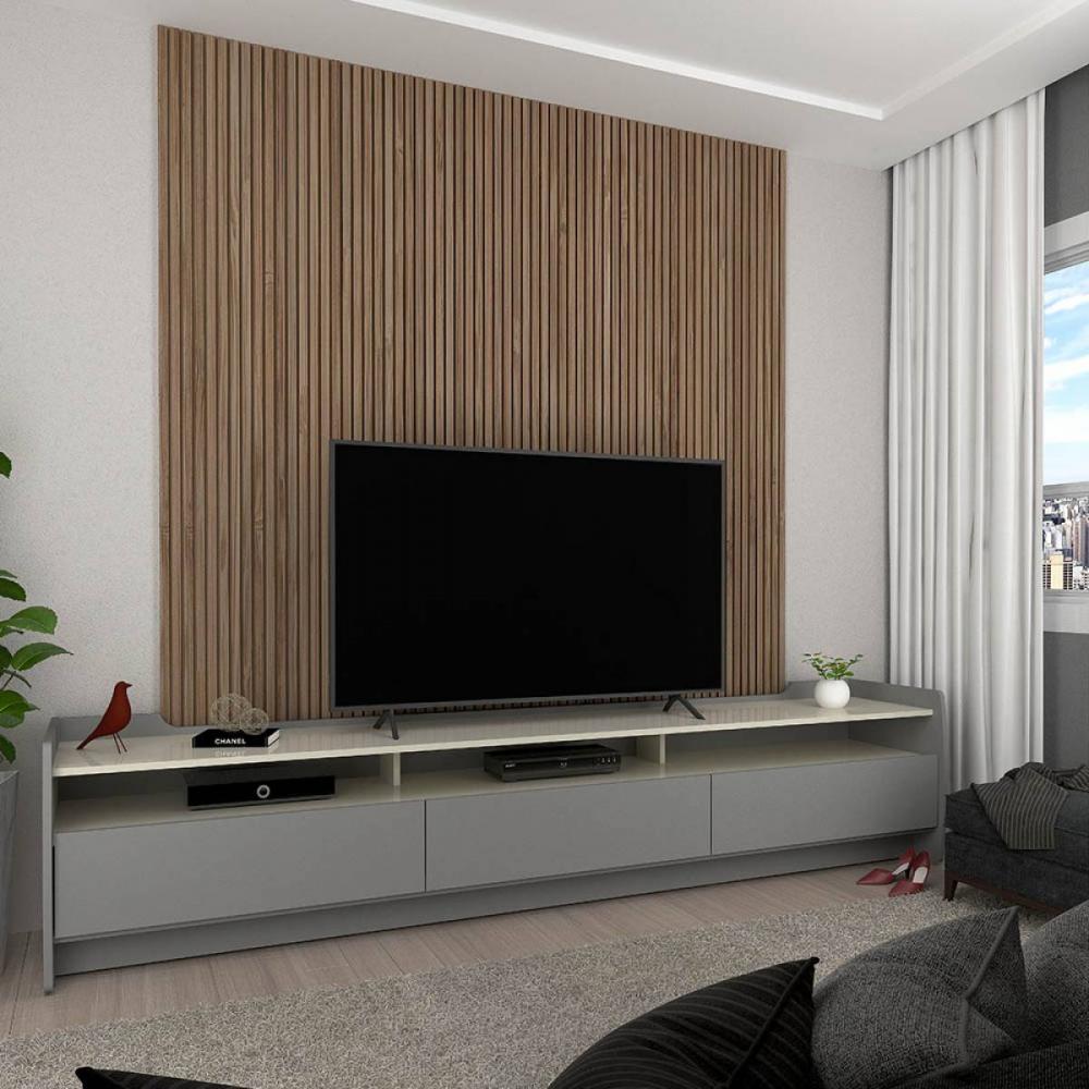 Rack Sublime 220 3G, Côr Cinza/Off Whiute, da Gelius Móveis, Medidas: Alt 0,48m Larg 2,195m Prof 0,44 Peso 51Kg, Estrutura 100% MDP com Delatlhes em MDF 15mm, 3 Gavetas ChanfradasTipo Flutuante com Corrediças Metálicas e Bordas Laqueadas em MDF 15mm, 3 Nichos para Eletroeletrônicos e Objetos Decorativos, Moldura e Lateral Traseira com Bordas Laqueados e Delhaes Arrendondados. Ideal para TVs até 75 Polegadas. Observação: Faça o Combo Rack + Painel, comprando o Painel Sublime 2.2 Cinza/Off White - Kit Sublime com 6 Rodizíos Sublime Branco é Opcional, sendo vendido separadamente.