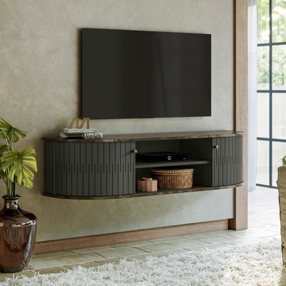 Rack Suspenso Modena, Côr Jade/Oliva, da Madetec, Medidas: Alg 0,295m Larg 1,360m Prof 0,310m Peso 12,5Kg - 1 Volume - Estrutura 100% MDP 15mm, 2 Portas Deslizantes Flexíveis de MDF, sobre Trilho de Plástico, que Acompanham as Laterais com Design Curvo, 2 Nichos Centrais Divididos por uma Prateleira, Passa Fio, Puxadores de Poliestireno Cromados, Suporte para até 10Kg. Ideal para TVs até 60 Polegadas. Acabamento em Pintura UV Fosco/Brilho.
