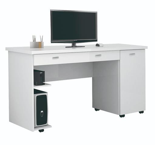 Escrivaninha Ariel, Côr Branco, da Móveis Primus, Medidas: Alt 0,785m Larg 1,365m Prof 0,445m, Estrutura 100% com 1 Porta de Bater com Dobradiças Metálicas, 3 Gavetas com Corrediças Telescópicas, Prateleira com Espaço para CPU e Estabilizador, Puxadores e Rodózios Plásticos.